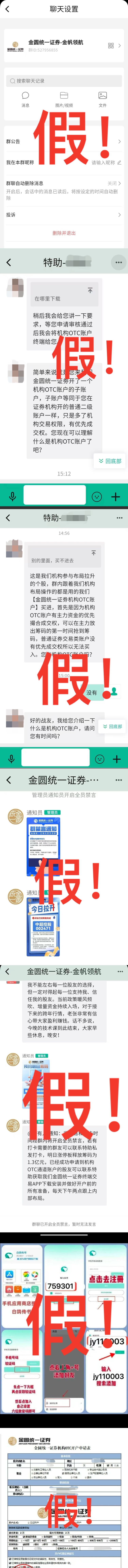 二、我司不存在设立微信群、QQ群或任何APP的群聊进行非法荐股、购买涨停板股票、承诺收益等行为,任何假冒金圆统一证券及工作人员通过群聊开展此类活动等行为,均属非法证券活动。