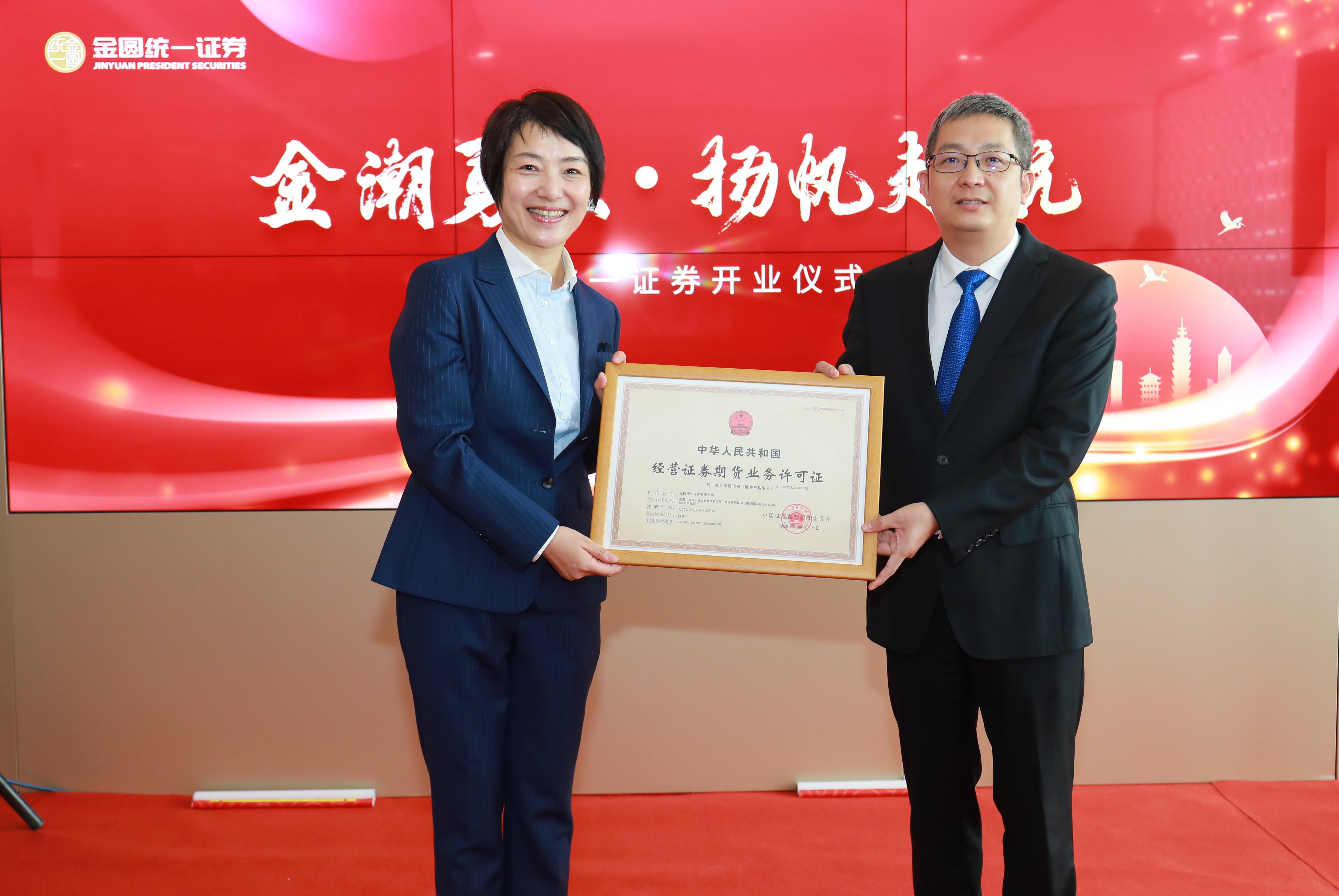 金圆统一证券是由厦门金圆集团和台湾统一证券联合发起设立的首家两岸合资证券公司,注册资本金12亿元人民币,可开展的业务包括证券经纪、证券自营及证券承销与保荐。自2月获得中国证监会核准设立以来,双方股东和筹建团队全力以赴克服疫情带来的不利影响,高质高效完成了公司人才队伍、整体制度、IT运营、办公场所的建设,制定了科学的业务发展规划,全力促成公司于9月17日正式获中国证监会颁发《经营证券期货业务许可证》。