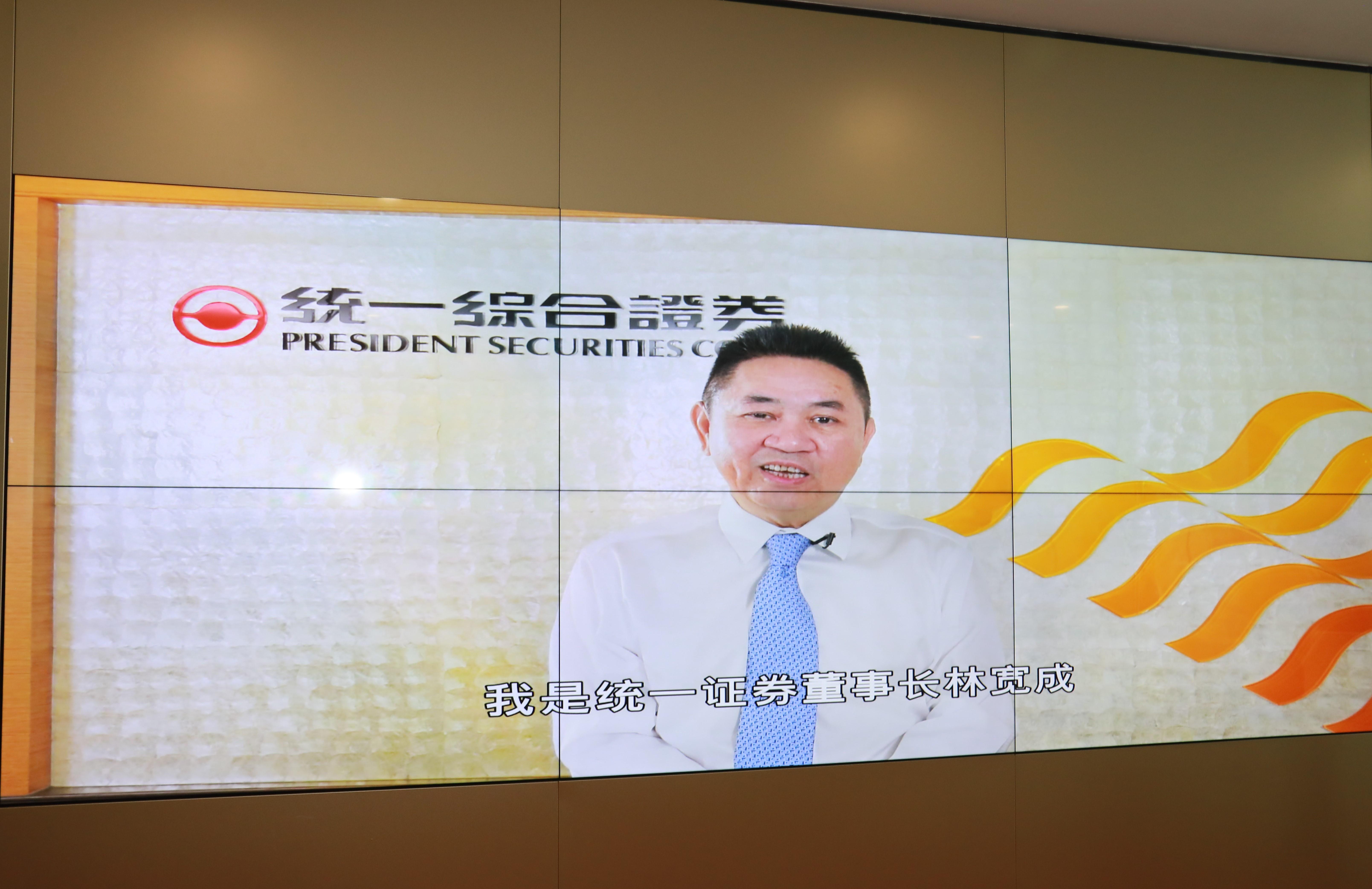 开业仪式中,股东统一证券董事长林宽成通过视频表示祝贺。