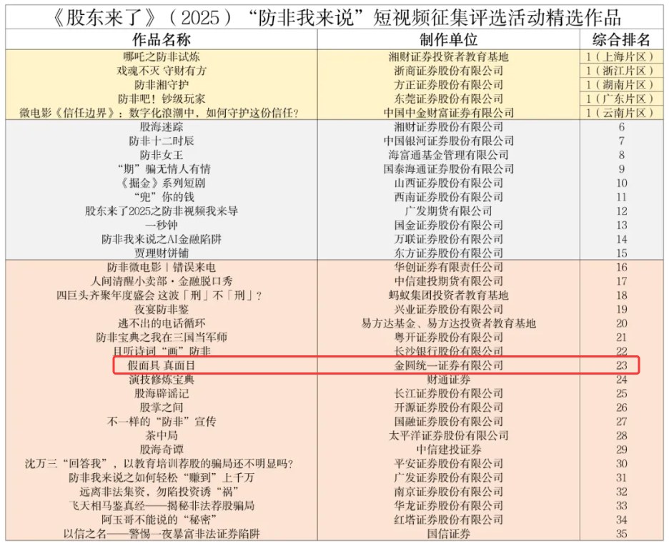 近日,由中证中小投资者服务中心联合各地证监局携手腾讯集团共同举办的《股东来了》(2025)“防非我来说”短视频征集评选活动结果揭晓。金圆统一证券精心制作的防非短片《假面具 真面目》,从证券、基金、上市公司、行业协会等535家单位的激烈角逐中脱颖而出,成功斩获“铜奖”!