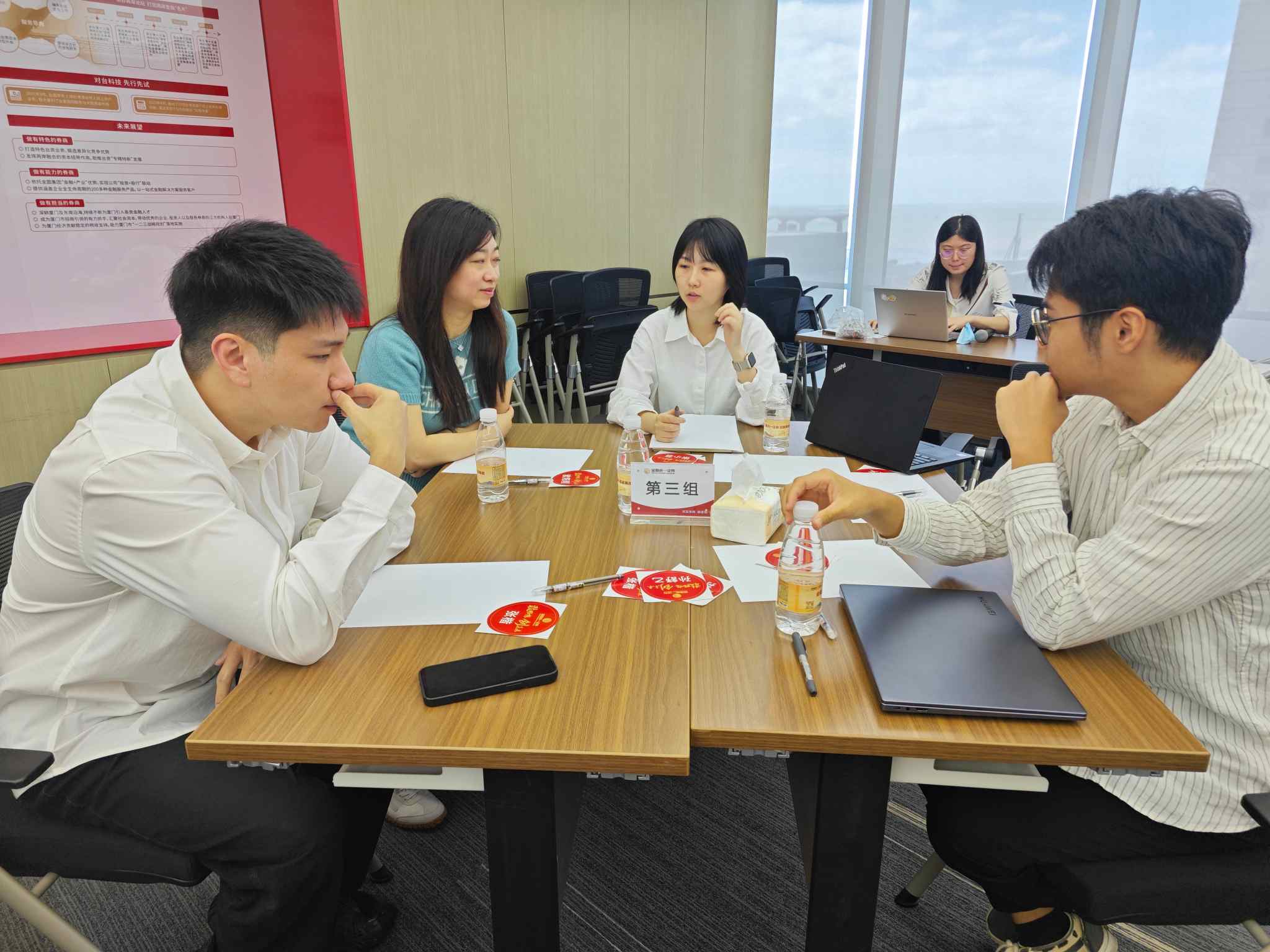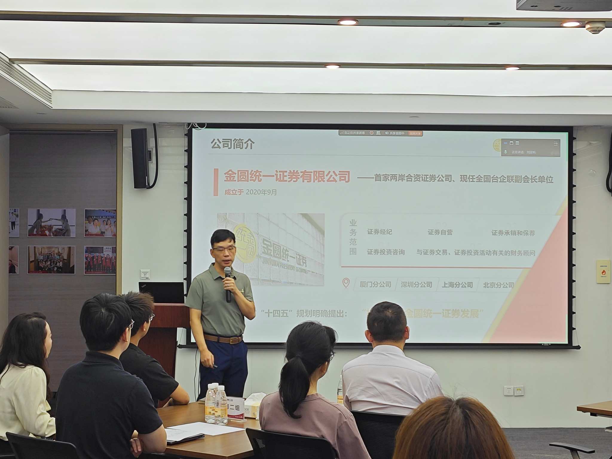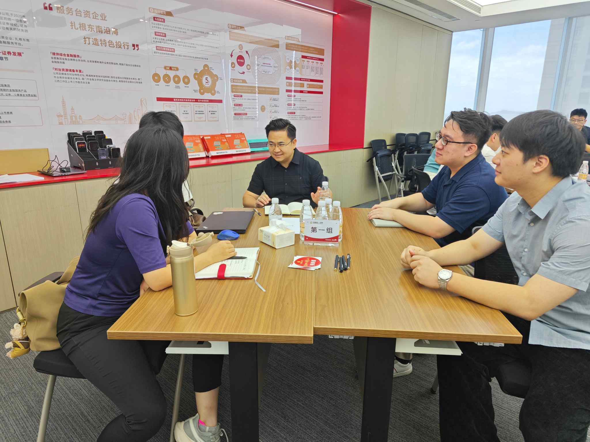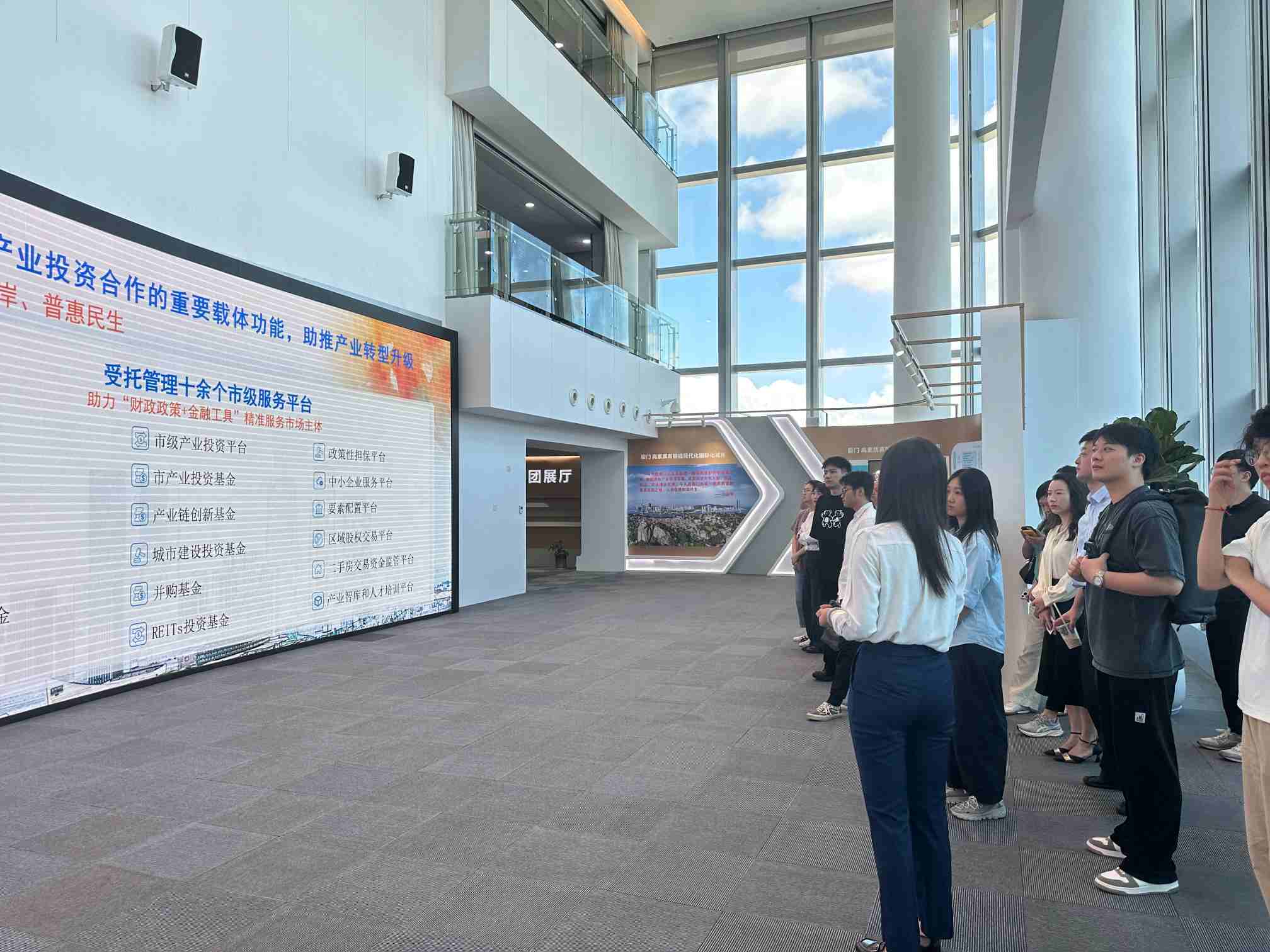 培训间歇,新员工们走进集团展厅,在专业讲解的引导下,依次参观“习近平同志在闽金融论述和实践经验”、集团业务板块介绍、践行两岸金融融合成果、赋能实体经济成果等展区。